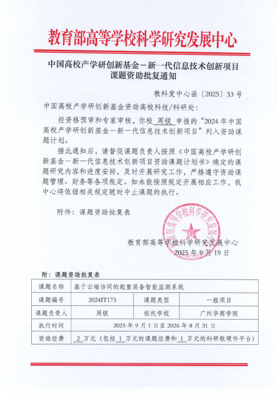 2025近日,由人工智能学院周锐科研团队申报的中国高校产学研创新基金—新一代信息技术创新项目“基于云端协同的起重装备智能监测系统”正式获批立项。该项目由教育部高等学校科学研究发展中心批准立项,是威廉希尔首次获批此类基金项目。项目面向新一代信息技术发展趋势,聚焦起重装备在实际工程中的智能化、信息化与系统协同等关键问题,旨在通过校企协同攻关,推动技术创新与成果转化。(信息技术创新项目课题资助批复)此次立项是我...