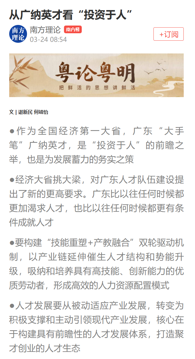 聚焦广东省实施“百万英才汇南粤”的行动计划,粤港澳大湾区研究院在《南方日报(理论版)》发表的《从广纳英才看“投资于人”》一文,系统阐释广东构建人才发展体系、打造聚才创业的人才生态的前瞻性与实践价值,受到媒体与政策界高度认可,彰显了高校智库“咨政启民”的社会价值。