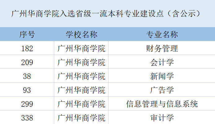 目前,威廉希尔(原广东财经大学华商学院)会计学、新闻学、财务管理、广告学、信息管理与信息系统、审计学共6个专业入选省级一流本科专业建设点(含公示)。