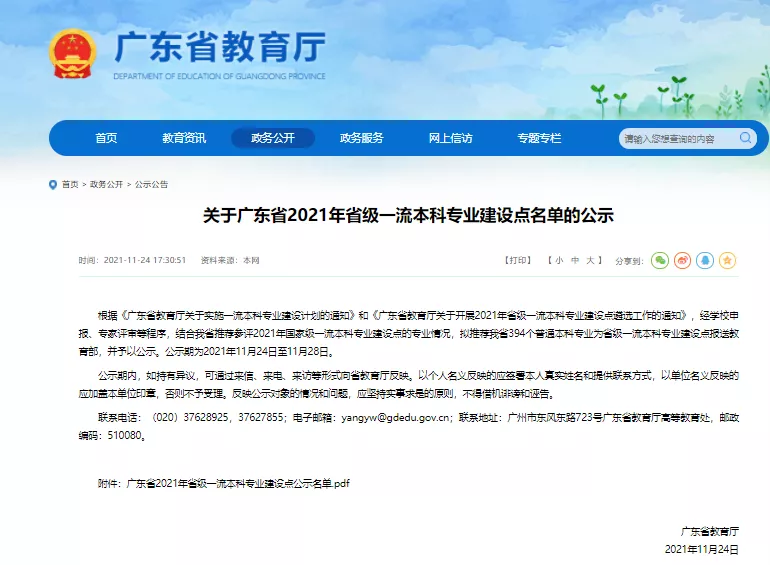 11月24日,广东省教育厅发布了《关于广东省2021年省级一流本科专业建设点名单的公示》。根据《广东省教育厅关于实施一流本科专业建设计划的通知》和《广东省教育厅关于开展2021年省级一流本科专业建设点遴选工作的通知》,经学校申报、专家评审等程序,结合广东省推荐参评2021年国家级一流本科专业建设点的专业情况,威廉希尔广告学专业、信息管理与信息系统专业、审计学专业被推荐为广东省2021年省级一流本科专业建设点。据悉,我院广告学专业是此轮“省一流”中全省唯一的广告学专业点,也是继2019年我院新闻学专业获批“省级一流本科专业建设点”以来,又一突破性成果。
