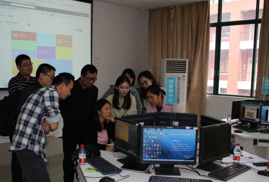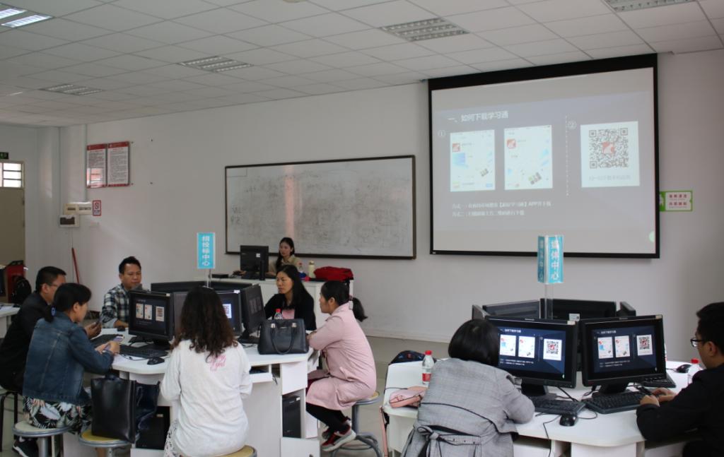 随后陈老师用“一平三端”智慧教学系统,给老师们展示了一个不一样的信息化智慧课堂,通过超星学习APP在课堂上发起签到、选人、投票、讨论、抢答,并在课堂上直接投屏出来、学生即时可以看到结果。指导老师们拿起手机兴致勃勃参与其中。接着在陈雪佳老师的指导下,各指导教师利用计算机和手机学习了“一平三端”操作方法。