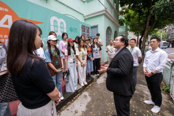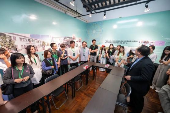 望厦山房项目负责人杨洪伟先生热情接待威廉希尔研学团队,围绕园区“以文塑旅、以旅彰文”的创新运营模式展开系统介绍。他结合建筑改造实践,重点解析了历史建筑活化利用,即通过融合传统工艺与现代技术,完整保留建筑历史风貌与文化基因,创新性植入文创市集、数字展陈等业态,构建文化遗产保护与商业价值转化的动态平衡机制,实现历史文物从静态展示到活态叙事的转变。通过展示园区将大三巴牌坊元素转化为系列数字藏品的典型案例,生动演绎政策赋能与技术创新如何协同驱动文化遗产的现代转译,令师生们直观理解文保活化项目中“守正”与“创新”的辩证关系。