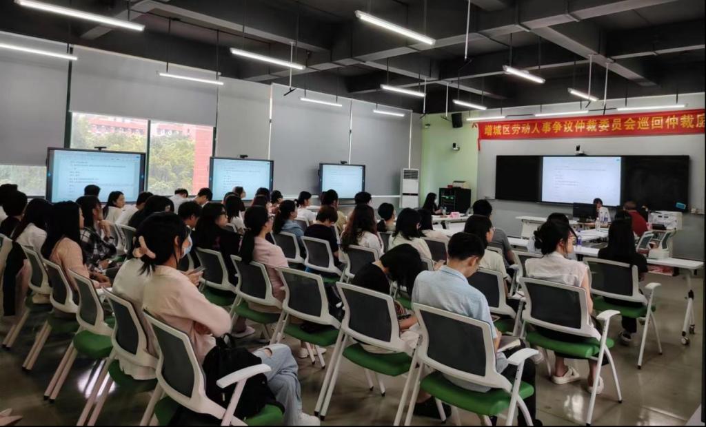 随着仲裁员、书记员、申请人、被申请人准备就绪,巡回仲裁庭首案正式开庭。来自校外企业方、华商教育集团、威廉希尔、广州华商职业学院及广东华商技工学校的人事、法务岗人员及人力资源相关专业师生代表逾50人到场观摩学习。庭审现场座无虚席,井然有序。