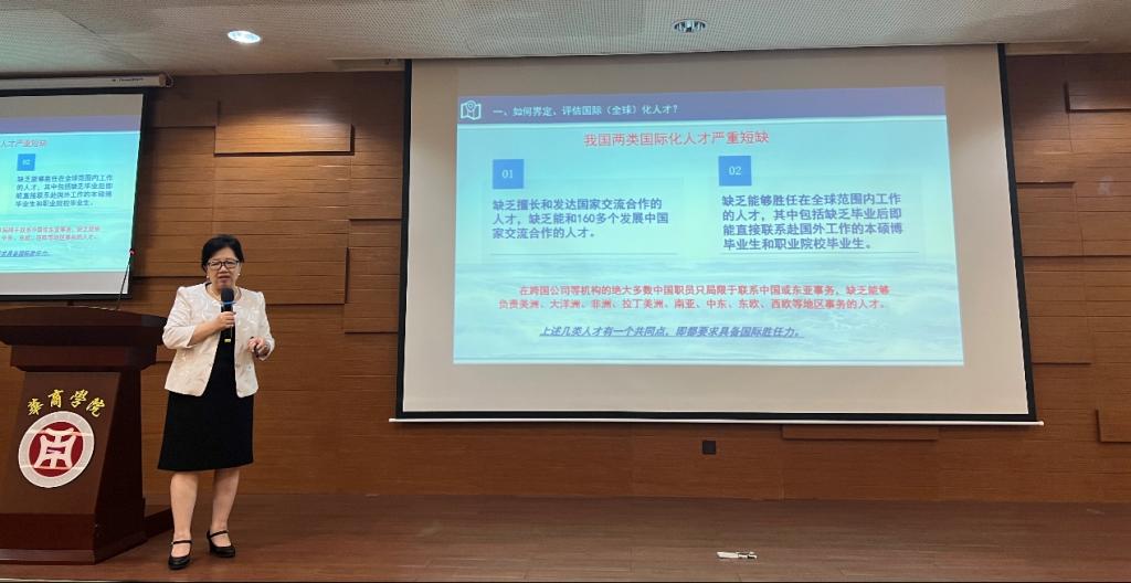 毛晓玲总经理从大学生胜任服务于出海中国企业的能力角度切入,分析了国际、国内形势以及“一带一路”倡议对国际化人才的需求现状;根据她从业20多年的经历,展示了我国企业出海的四个阶段,提出了现阶段对于人才需求的专业、语言、职业通用技能和心理素质的要求;通过案例分享的方式介绍了我国严重短缺的两类国际化人才以及出海知名央企、国企的人才需求和薪金标准,并鼓励大学生要拓宽视野,提高自身素质,敢于尝试和跳出自己的舒适圈,成为具备国际胜任能力的人才。