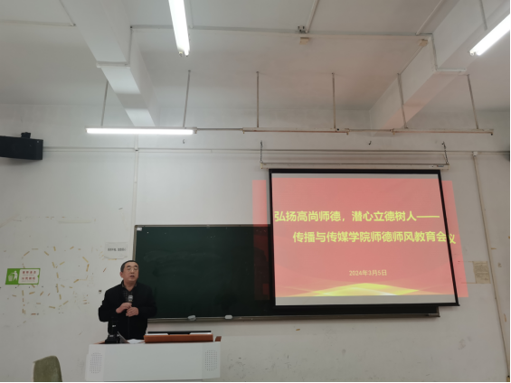 张晋升院长做总结讲话,他首先传达了3月1-2日召开的学校高质量发展大会有关精神,并总结了传播与传媒学院过去几年取得的成绩,对学院接下来的重点工作做了安排部署。