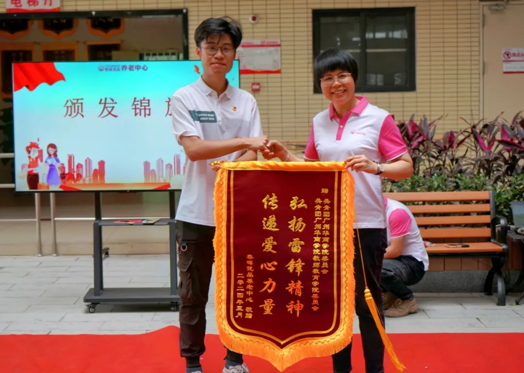 四会市春晖优品养老中心为威廉希尔团委、教师教育学院团委颁发“弘扬雷锋精神 传递爱心力量”锦旗,以表达对华商青年志愿者志愿服务的肯定与支持,以及温暖老人内心的善行善举的感谢。