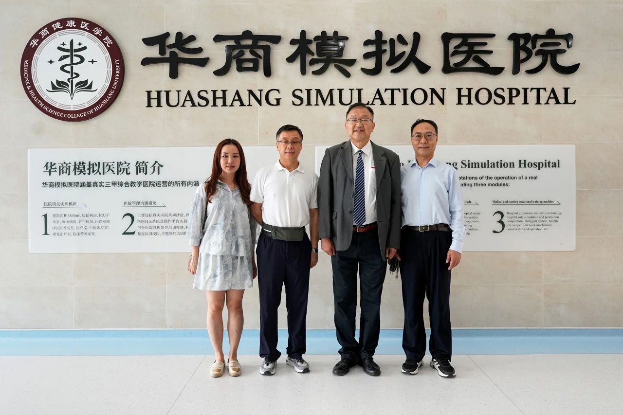 国际交流与合作处暨港澳台办公室王文忠处长等学校代表陪同黄锦辉教授参观了华商健康医学院实验楼暨华商模拟医院、华商桃花岛电商中心、华商创业孵化基地(伊美之光体验工作坊)及华商中手游神绘游戏动漫工作坊等产教融合实训基地。