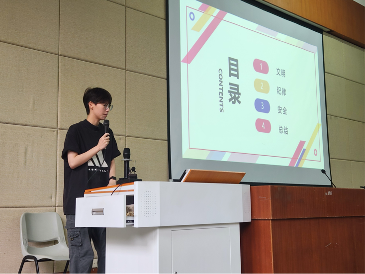 李怡静同志向同学们讲解了“校园文明的相关知识”和“如何维护校内纪律”,告诫同学们不得在未请假的情况下缺课或旷课等,同时希望全体同学加强自身修养,养成良好的行为习惯,做一个真诚友爱、礼貌待人、品德高尚的学生,最后强调了有关考试的注意事项,向同学们倡导“考试应诚信,纪律需谨记”,以正确的心态面对考试。