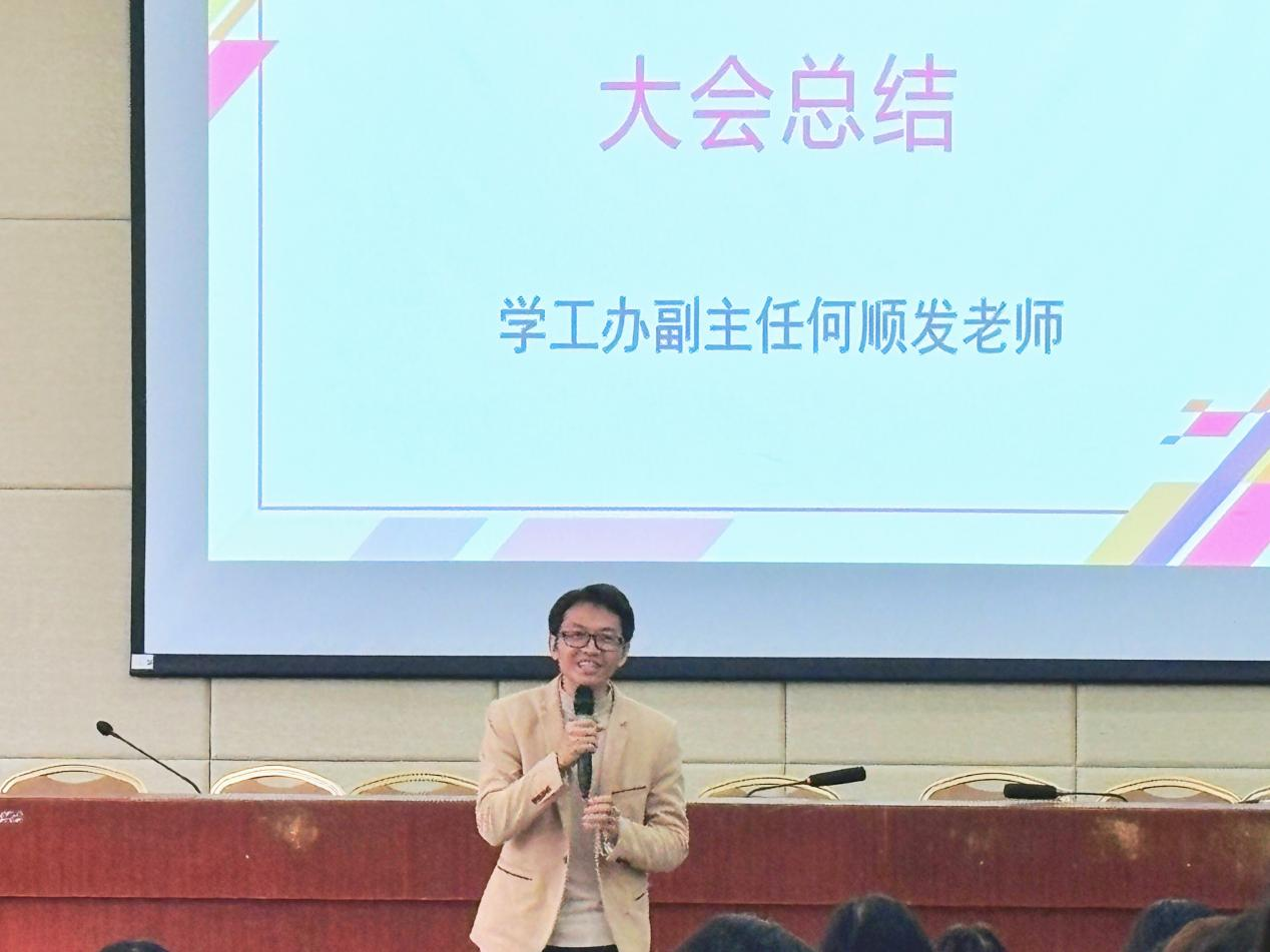 学工办副主任何顺发老师作总结发言。他以“创百年名校,育华夏英才”的办学理念和“厚德、励志、博学、创新”的校训为引导,倡议同学们讲文明、重安全、守纪律、促和谐,激励同学们与时俱进,努力奋斗,关注社会发展动态,提升自我综合能力。他向同学们传递了如何学习、如何认识世界、认识自我的方法,希望同学们在新学期向上向善,明确学习目标和发展方向,开拓创新,奋发有为,不负青春,不负时代。
