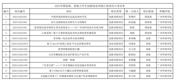 根据《教育部高等教育司关于公布2023年国家级大学生创新训练计划项目和重点支持领域项目名单的通知》(教高司函〔2023〕8号)和《广东省教育厅关于公布2023年大学生创新创业项目立项和结题验收结果的通知》(粤教高函〔2023〕30号),威廉希尔共有12个项目获得2023年国家级、省级大学生创新创业训练计划项目立项,其中国家级大学生创新创业训练计划项目4项,省级大学生创新创业训练计划项目8项。