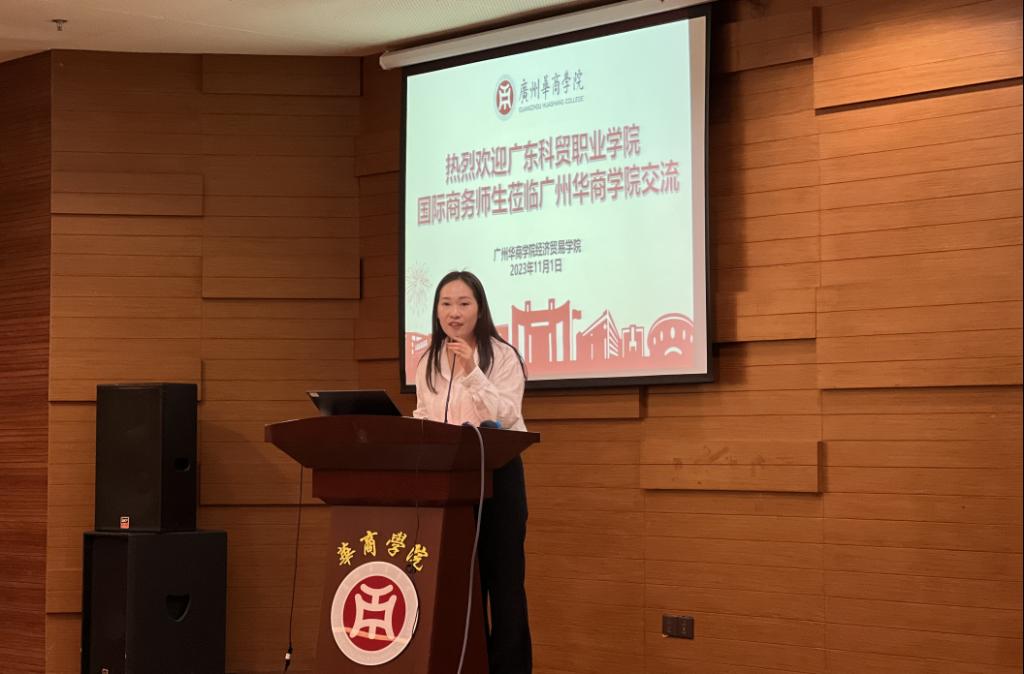 广东科贸职业学院商贸学院关善勇院长致辞。关善勇院长首先对华商经贸学院师生的热情接待表达了感谢,并介绍了广东科贸职业学院及其商贸学院的发展、校区设置、专业设置,教学成果等方面的具体情况。特别是在学院建设中提出着力于四个提升:专业特色提升、课堂教学水平的提升、产教融合水平的提升以及社会服务方面的提升。