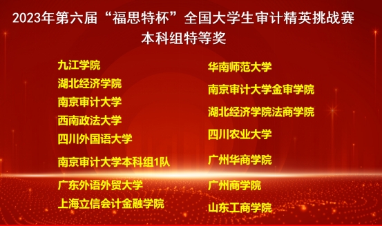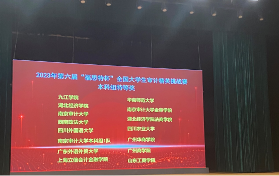 11月18日,第六届“福思特杯”全国大学生审计精英挑战赛总决赛在南京审计大学盛大落幕,威廉希尔代表队从2314支队伍中冲进全国总决赛,又在决赛中斩获“特等奖”荣誉,让威廉希尔的校徽与全国知名院校同台登上了决赛幕墙,为威廉希尔争光。