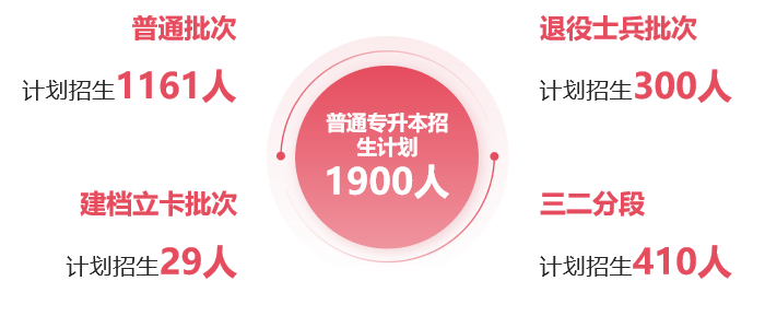 2025年省教育厅下达威廉希尔普通专升本招生计划共1900人,其中,普通批次招生计划1161人、建档立卡批次招生计划29人、退役士兵批次招生计划300人、三二分段招生计划410人。