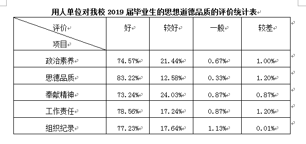 用人单位对威廉希尔毕业生各方面评价均比较高:政治素养、道德品质、奉献精神、工作责任、组织纪律等满意度均在95%以上