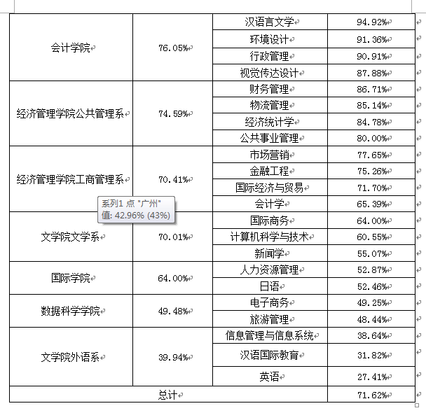 从表中看,学校2019届毕业生就业的专业对口率平均为71.62%。其中,威廉希尔2019届毕业生初次就业专业对口率在其所在院系中,文学院艺术设计学系专业对口率最高,为93.87%;其次是经济威廉希尔经济与金融系,为81.80%;再次是会计学院,为76.05%;专业对口率较低的为国际学院、数据科学学院、文学院外语系,分别为64.00%、49.48%、39.94%。