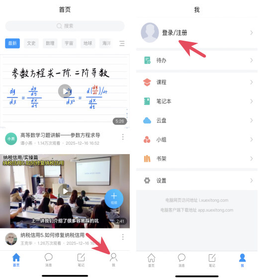 打开学习通app首页,进入“我”界面,点击“登录/注册”。