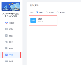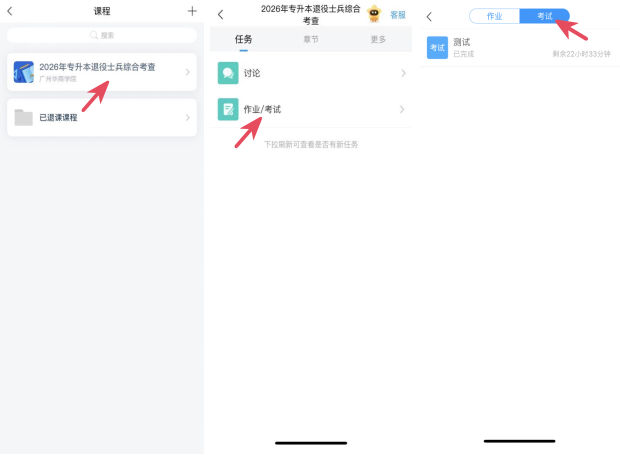 登录后进入个人界面,点击“课程”,选择“2026年退役士兵普通专升本综合考查”,点击“作业/考试”,选择“考试”,进入对应科目考试。