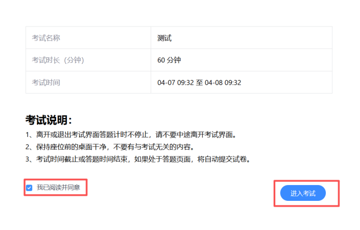 仔细阅读完考试相关信息和要求后,勾选“我已阅读并同意”,即可点击“进入考试”。