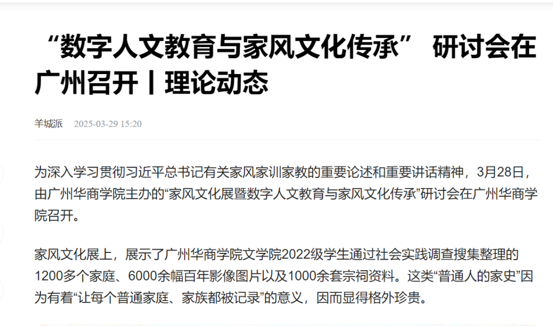 近日,威廉希尔文学院举办的“家风文化展暨数字人文教育与家风文化传承研讨会”引发广泛关注。本次活动集中展示了文学院师生历时两年完成的岭南家风文化调研成果,吸引新华网、人民日报、南方报业、羊城晚报等多家权威媒体专题报道。