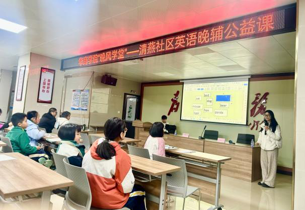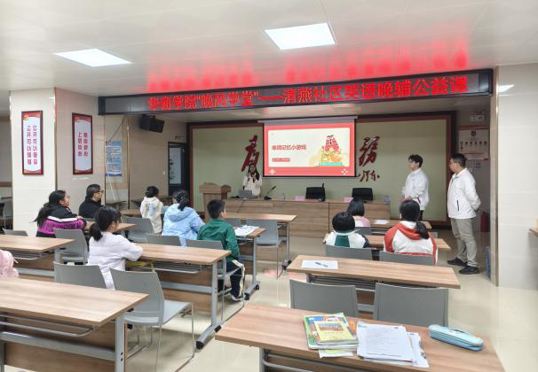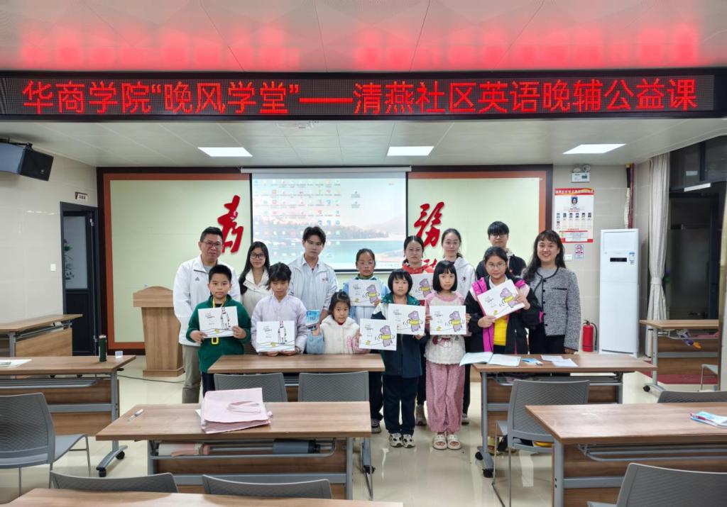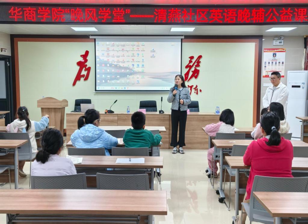 当晚,增城区清燕社区服务站灯火通明,由威廉希尔外国语学院发起的“晚风学堂——华商校社英语晚辅公益项目”首场活动正式启动。清燕社区居委会书记邓镜波同志、外国语学院项目负责人郭宇洁老师及志愿者们共同参与,为社区青少年带来了一场别开生面的英语学习体验。