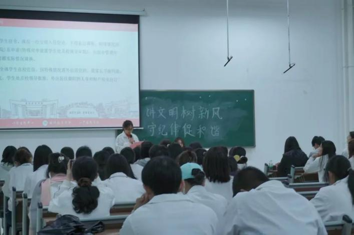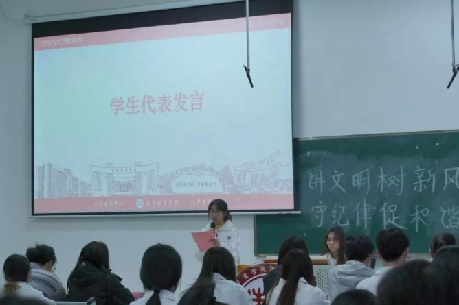 随后,学检部工作人员进行学生手册纪律主题宣讲。她着重强调了文明、安全、纪律作为校园生活基石的重要性,指出其对于维护校园秩序和保障学生成长的深远意义。学院将全力支持此次活动,提供必要指导与帮助,以身作则,坚定决心为创建和谐、文明、优秀的校园环境贡献力量。为此,学院将成立系课堂文明督察队和考勤检查组,严抓课堂纪律,并开展文明宿舍评比活动,以评选出先进班级,为教育月活动的顺利开展奠定坚实基础。