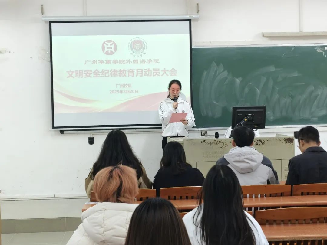 3月20日中午,外国语学院在广州校区厚德楼C213召开“文明安全纪律教育月”动员会。外国语学院副院长何顺发,辅导员郭宇洁、江嘉丁、张超、孔翊先出席本次大会。