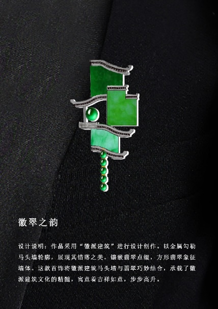 设计思路:作品《徽翠之韵》采用“徽派建筑”进行设计创作。以金属勾勒马头墙轮廓,展现其错落之美。镶嵌翡翠点缀,方形翡翠象征墙体。这款首饰将徽派建筑马头墙与翡翠巧妙结合,承载了徽派建筑文化的精髓,寓意着吉祥如意,步步高升。
