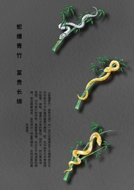 设计思路:《蛇缠青竹·富贵长绵》这一设计灵感源自于中国传统文化中对蛇与竹子的独特寓意与象征。蛇,在中国文化中常被视为智慧、神秘、健康与长寿的象征;而竹子,则以其高洁、坚韧、节节高升的特质,寓意着清廉、纯洁与不断进取的精神。将这两者结合,旨在传达一种富贵绵长、吉祥如意的美好愿景。
