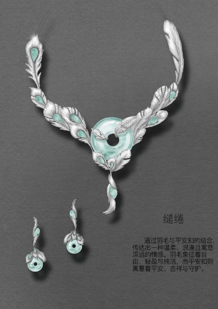 设计思路:《缱绻》通过羽毛与平安扣的结合,传达出一种温柔、浪漫且寓意深远的情感。羽毛象征着自由、轻盈与纯洁,而平安扣则寓意着平安、吉祥与守护。