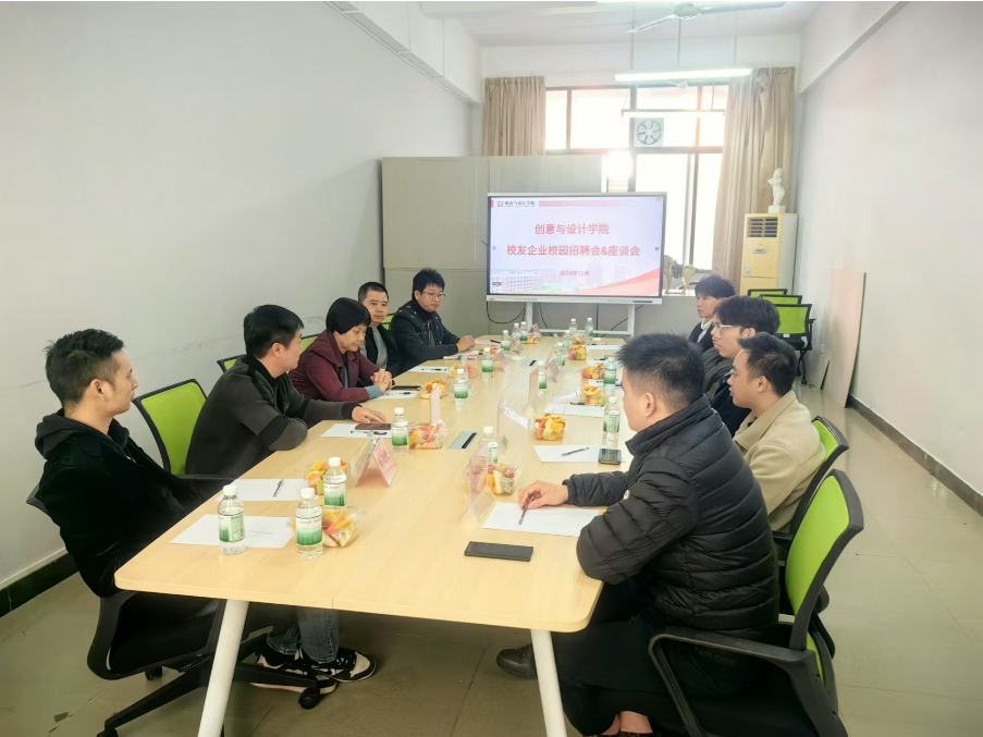 招聘会结束后,创意与设计学院在厚德楼B106会议室召开校友座谈会。学校王锦秀顾问,创意与设计学院杨磊副院长、蒋明副院长、院长助理黄功翔、环境设计系副主任叶伟森、学工办副主任钟纯,校友办吴泽佳老师及多位校友代表参加座谈。会议由钟纯主任主持。