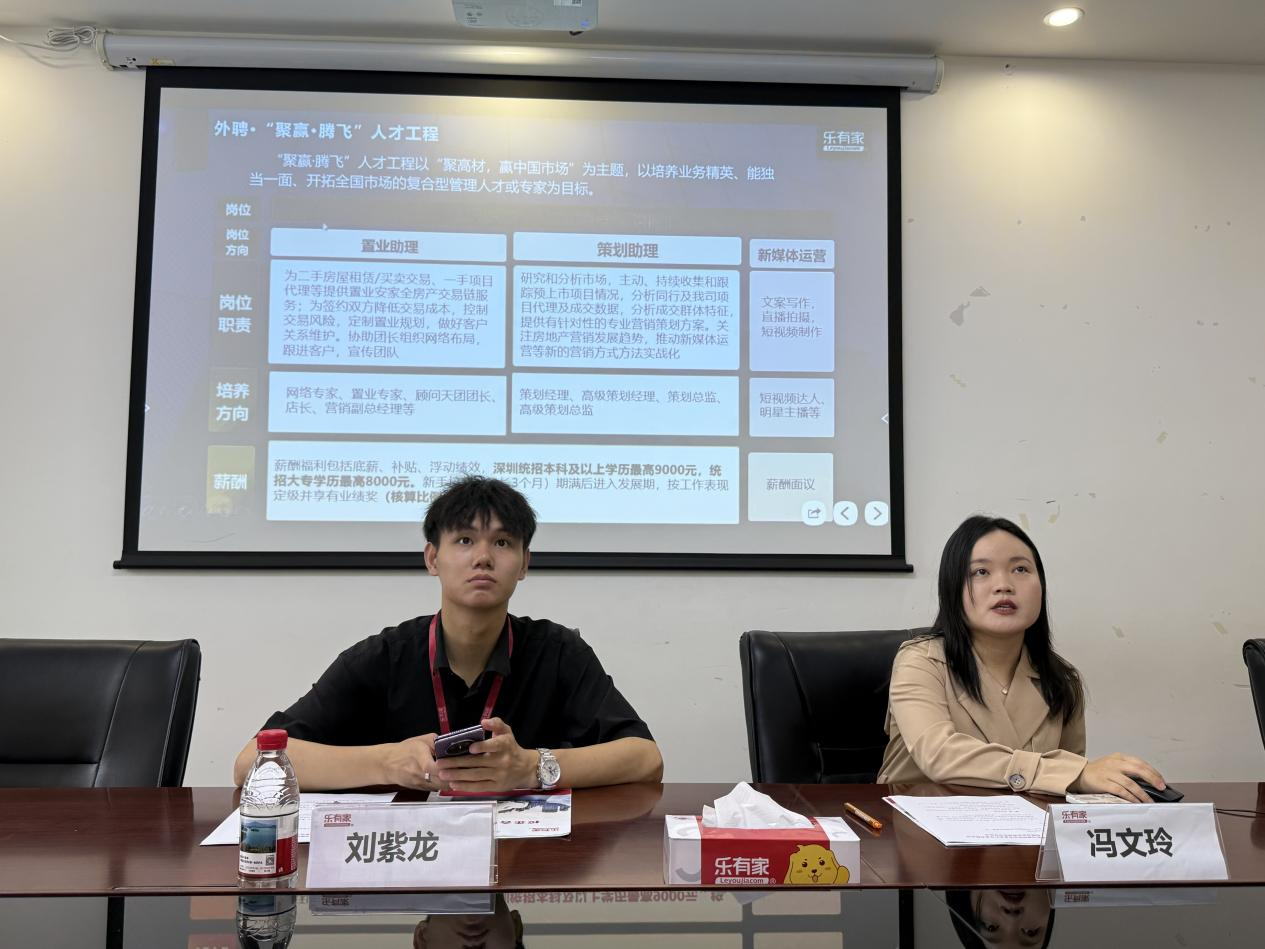 座谈会上,人力部冯文玲总监对深圳乐有家集团进行了详细的介绍,包括集团旗下的品牌、公司规模及实力、发展历程及核心优势。同时,冯文玲总监强调,乐有家集团的人才政策、福利制度非常完善,不仅晋升路径清晰,还展示了充分的人文关怀,例如设置了随心假、孝顺日、恋爱假等假期,因此吸引了大量的年轻人才。目前公司员工规模已达两万人。随后,市场部刘紫龙总监对企业用人需求进行了介绍,并表示:“企业非常看重员工的学习能力与持续的行动力,除此以外,亟需兼具政策分析能力与数字化工具应用能力的人才。”