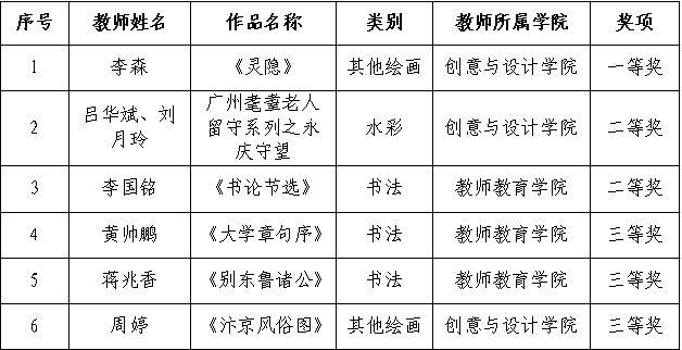 根据《广东省教育厅关于举办第七届粤港澳大湾区学校美术作品展暨第九届广东省高校美术作品学院奖双年展的通知》的安排,威廉希尔积极组织教师参与,涵盖了书法、绘画、水彩等多个领域,经省级复赛、现场评审,威廉希尔六位教师荣获一等奖1项,二等奖2项,三等奖3项。