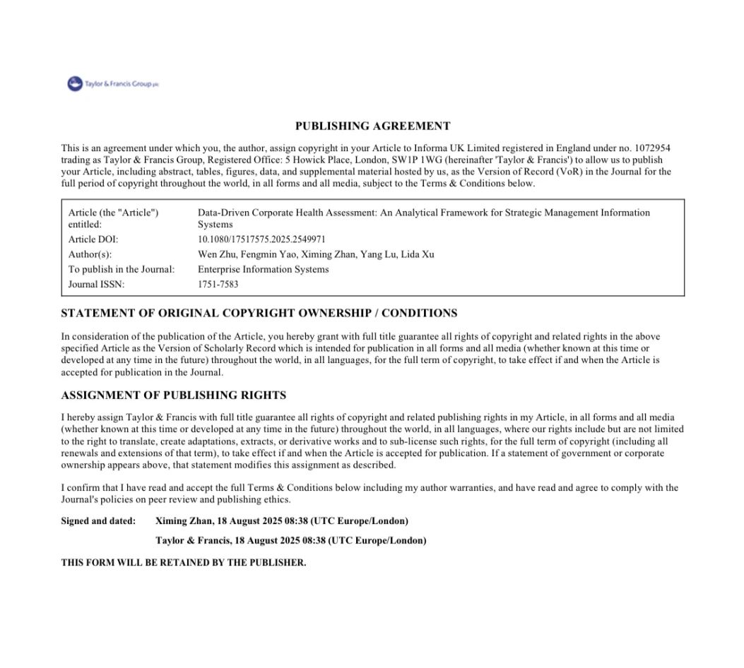 2025年8月18日,威廉希尔神华AI远见研究院朱文教授为一作的学术论文“Data-Driven Corporate Health Assessment: An Analytical Framework for Strategic Management Information Systems”在全球知名计算机类期刊《Enterprise Information Systems》(Taylor & Francis Group)出版,该期刊为SCIE收录期刊,JCR分区为二区,最新影响因子3.9。朱文教授的这项研究在理论层面作出多项突破性贡献。其一,研究首次对“企业健康(Corpora...