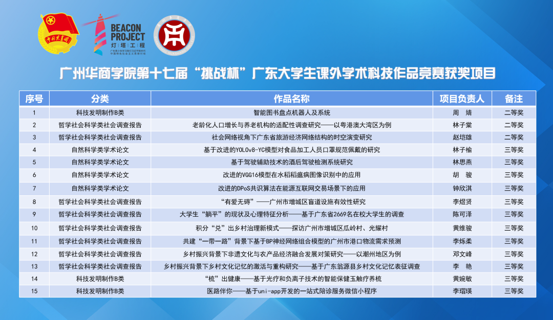 5月27日至28日,由共青团广东省委员会、广东省教育厅、广东省科学技术厅、广东省科学技术协会、广东省社会科学院、广东省学生联合会联合主办的第十七届“挑战杯”广东大学生课外学术科技作品竞赛终审决赛在中山大学(广州校区南校园)落下帷幕。