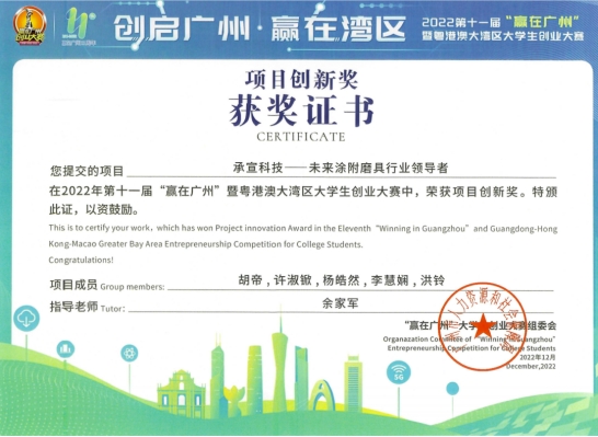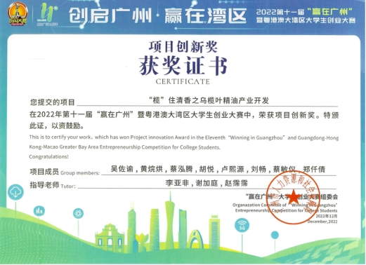 由广州市人力资源和社会保障局主办,中国南方人才市场管理委员会办公室承办的2022年第十一届“赢在广州”暨粤港澳大湾区大学生创业大赛圆满落幕。威廉希尔《“榄”住清香之乌榄叶精油产业开发》《稚影传媒——融媒体领域专业服务商》《承宣科技——未来涂附磨具行业领导者》《智慧城市ICT》《藏香阁——中药香水》5个项目均荣获项目创新奖,威廉希尔荣获优秀组织奖。