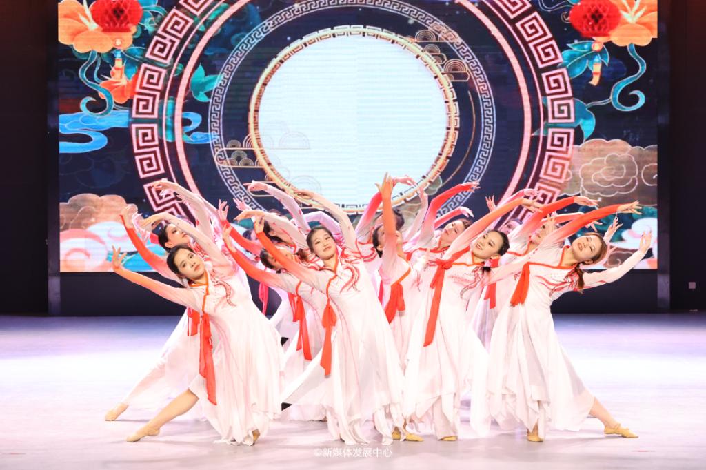 《盛世欢歌》隆重开场。喜庆激昂的乐声响起,舞蹈队的队员们犹如美丽的白鹤,踩着配乐鼓点,轻盈雀跃的舞步纷纷亮相,俨然百花齐放,摇曳生姿。