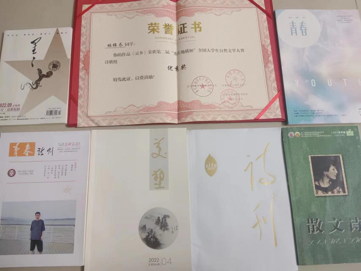 (林梓乔发表作品的刊物封面及获奖奖状)