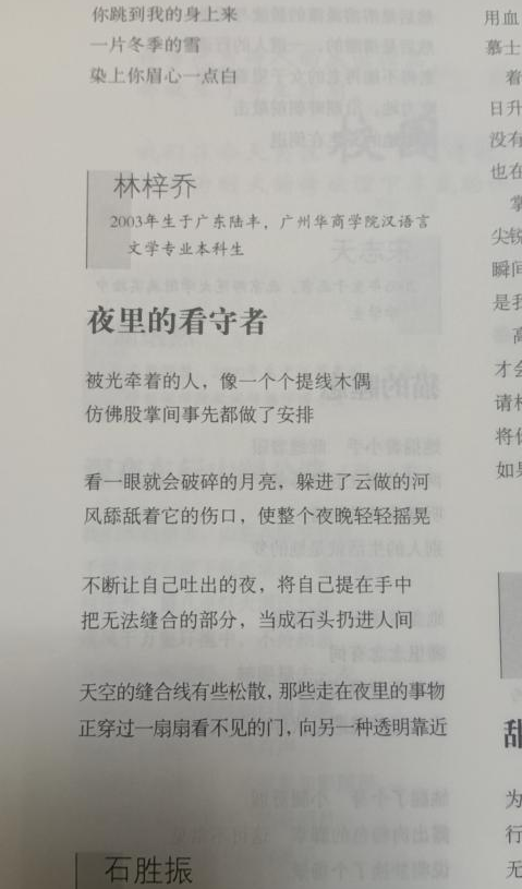 2023年6月发表诗歌《夜里的看守者》于《诗刊》2023年刊第14期。