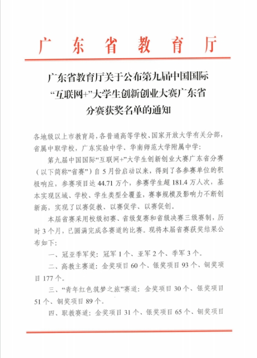 第九届中国国际“互联网+”大学生创新创业大赛广东省分赛(以下简称“省赛”)自5月份启动以来,得到了各参赛单位的积极响应,威廉希尔紧密围绕大赛提出的“更中国、更国际、更教育、更全面、更创新、更协同”的要求,认真筹划、积极组织,落实立德树人根本任务,传承和弘扬红色基因,聚焦“五育”融合创新创业教育实践。学校领导、各相关部门、各学院高度重视和大力支持,多次开展相关讲座及辅导培训,激发威廉希尔学生的创新创造热情,深度挖掘培育优秀的创新创业项目,不断提升参赛项目的质量和水平。