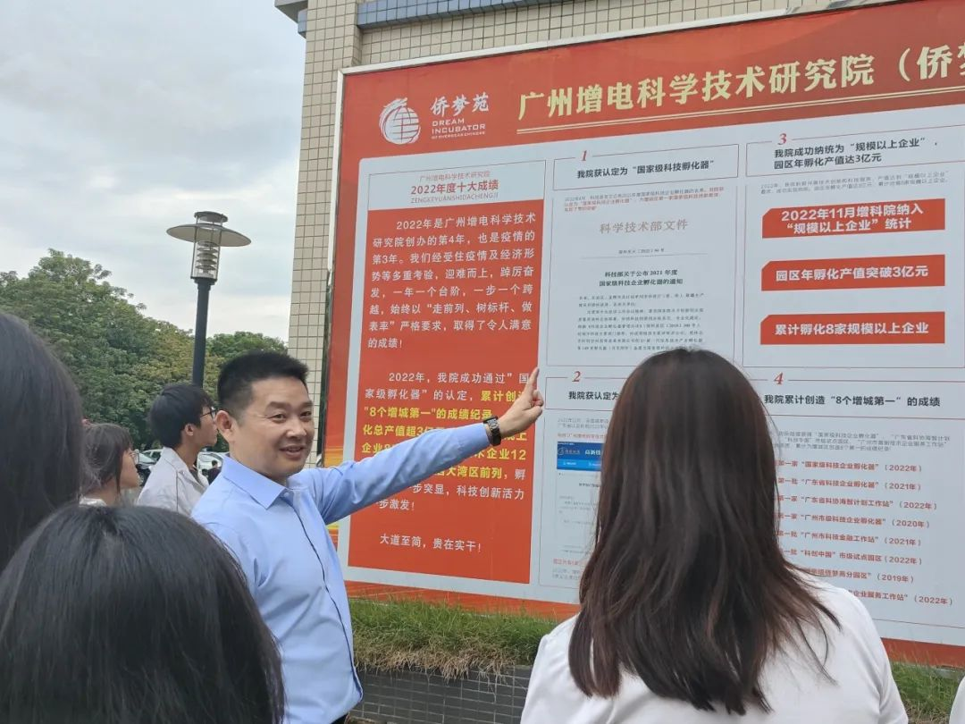 广州增电科学技术研究院副总经理杜勇华代表增科院对研学团表示热烈欢迎,并带领研学团参观增科院,详细地向研学团介绍了增科院的园区。增科院是在增城区政府的大力支持下,由电子科技大学广东电子信息工程研究院牵头,联合院士、国家级高层次人才等国际创新资源建设的新型、专业化的“科技成果产业化基地”。