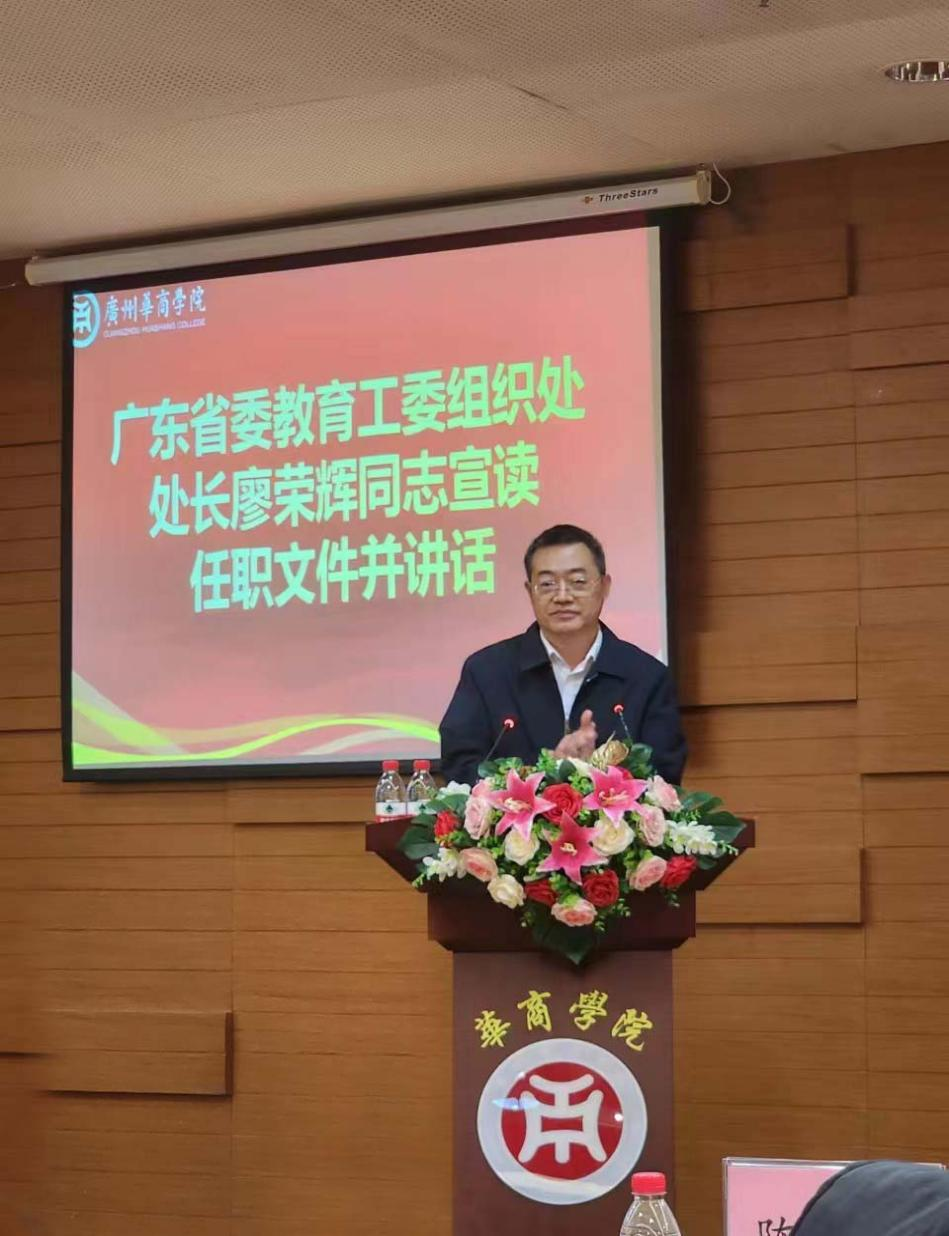 省委教育工委组织处廖荣辉处长宣读任职文件并讲话。廖处长宣布,经中共广东省委教育工作委员会、广东省教育厅研究决定,陈玉欢同志任威廉希尔党委书记兼督导专员。