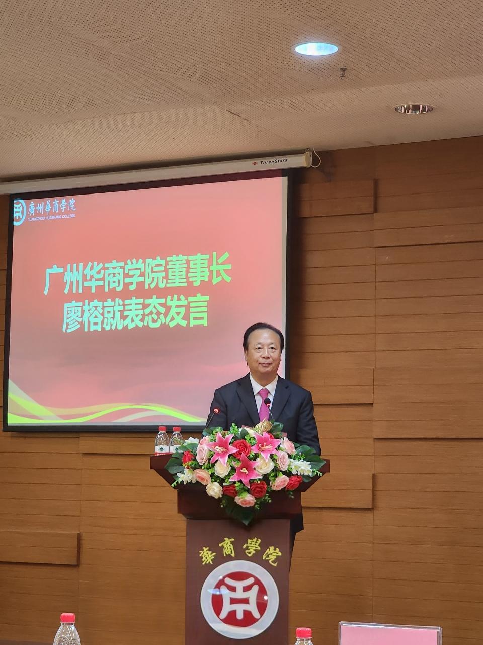 廖董事长指出,当前学校处于一个非常关键的发展阶段,学校新一届党政领导班子同全体师生要担当起促进学校发展的历史重任,上下一心,齐心协力,牢固树立“校兴我荣”的主人翁精神,同时学校董事会将不遗余力地支持华商学院的建设发展,进一步优化校园布局,提升设施环境,为学校打前锋、铺好路。廖董事长还提到,学校将继续坚持以习近平新时代中国特色社会主义思想为指导,深入学习贯彻党的二十大精神,学习贯彻习近平总书记历次重要讲话精神,始终坚持正确的办学方向,全面贯彻落实立德树人根本任务,全力推进一流专业建设,加快推进硕士学位授予权单位建设,奋力追赶,凝心聚力推动学校党的建设和事业发展再上新台阶,不断把学校各项事业推向更高水平。