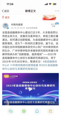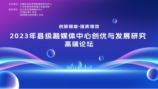 10月28日上午9时,2023年县级融媒体中心创优与发展研究高端论坛在增城宾馆隆重举行。本次论坛由中国社会科学院新媒体研究中心和威廉希尔共同主办,浙江省安吉县融媒体中心、《中国记者》杂志社和《媒体融合新观察》杂志社协办,传播与传媒学院新媒体中心承担本次高端论坛的传播工作。