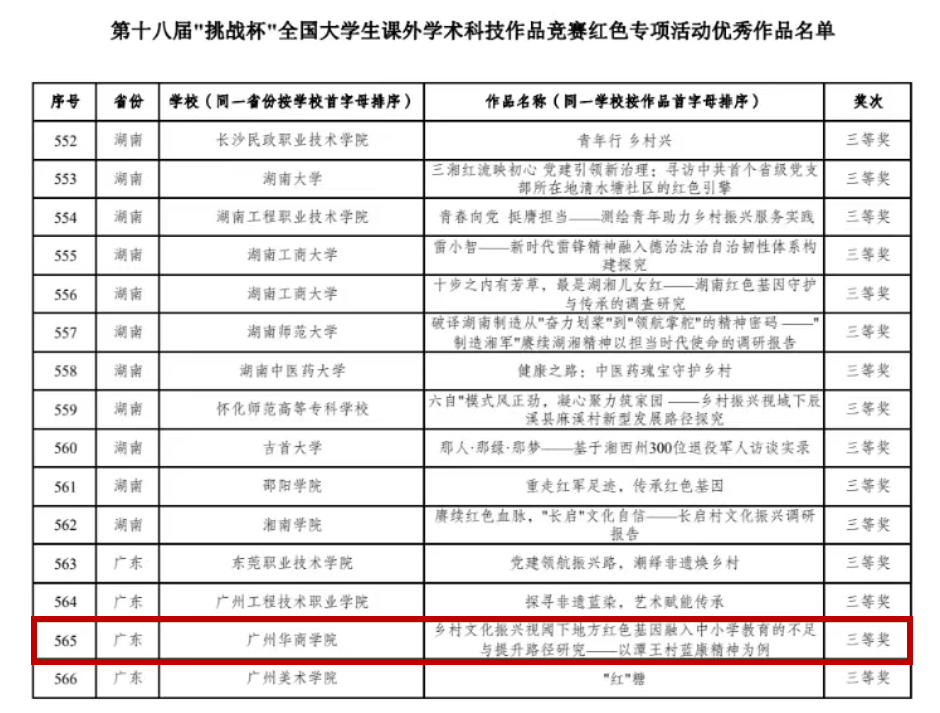 威廉希尔2023年暑期三下乡社会实践团队“青衿萤火”作品《乡村文化振兴阈下地方红色基因融入中小学教育的不足与提升路径研究——以潭王村蓝康精神为例》荣获第十八届“挑战杯”全国大学生课外学术科技作品竞赛红色专项活动三等奖。