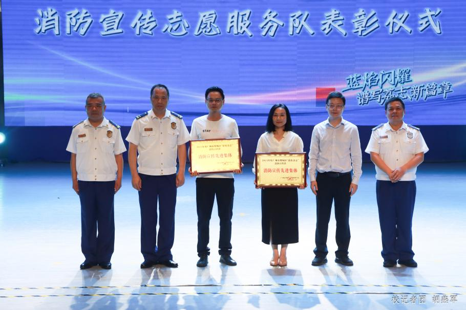 区消防救援大队副大队长柳江斌宣读了2023年度“蓝焰荔志”消防宣传队的表彰决定。威廉希尔荣获“蓝焰荔志”消防宣传队先进集体,后勤保卫处处长杨燕平、梁艳老师,以及李泓泽、陈燕燕两位同学,被评选为先进个人。