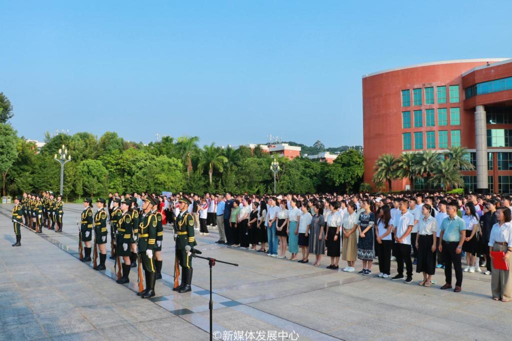学校党委书记陈玉欢,党委委员、副校长王卫平,党委副书记、纪委书记、副校长吕峻闽,党委委员、副校长许娜,肇庆校区党委书记苏宁,纪委委员、校长助理覃少冰主任,党委委员、党委办公室吕书勉主任,党委学生工作部黄国富部长,校团委陈刚书记,各二级学院党委副书记、学工负责人、团委书记、团委副书记、学生会指导老师、辅导员及学生代表近2000人参加本次升旗仪式。升旗仪式由党委委员、党办主任吕书勉主持。