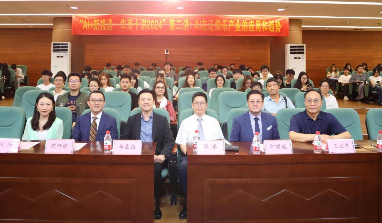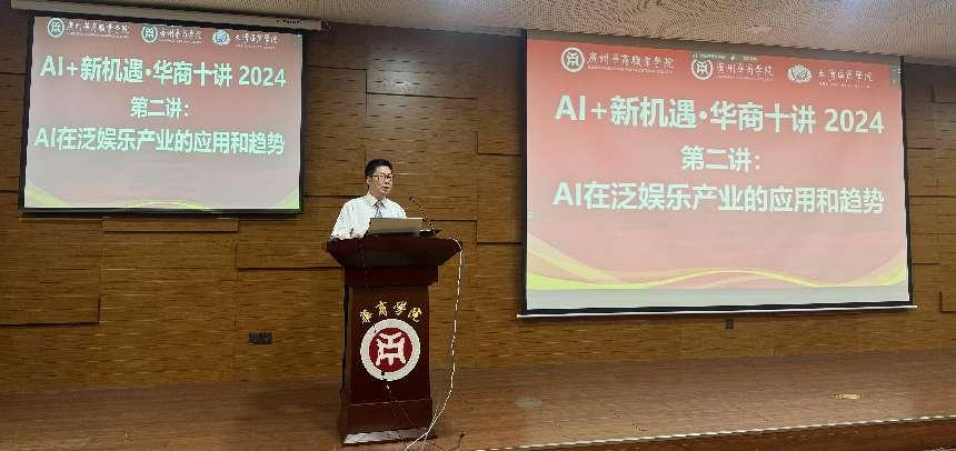 9月24日下午,华商教育集团旗下三所院校,威廉希尔、大湾区商学院、广州华商职业学院联合举办的大型系列公益讲座“AI+新机遇•华商十讲”之第二讲“AI在泛娱乐产业的应用和趋势”在威廉希尔图书馆举行。粤港澳三地近3500人线上线下参加此次活动。蓝海国际资本有限合伙基金合伙人李嘉俊先生为本次讲座的主讲人。中汇集团印国庭总监、大湾区商学院协理副校长陈行健教授、威廉希尔校长助理张军教授、国际交流与合作处王文忠处长、广州华商职业学院国际教育学院钱芳院长及师生代表参加现场活动。