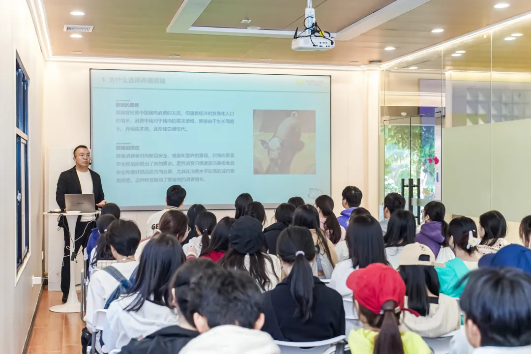 研学团实地参观黑猪养殖和黑米种植基地,了解了企业运用多种创新技术提升生产效率和产品质量的实践经验。莲花出水农科小镇生猪产业项目CEO黎炽明、黑米产学研项目CEO陈泓良为威廉希尔师生详细介绍了华香黑猪养殖和黑米种植的产业概况,全面阐释华香黑猪和黑小宝全谷黑米对品质与健康的追求。农科小镇充分体现了科技创新在农业领域的应用,在科技的帮助下,有效提高当地农业资源的产出量,显著提升了产品附加值。
