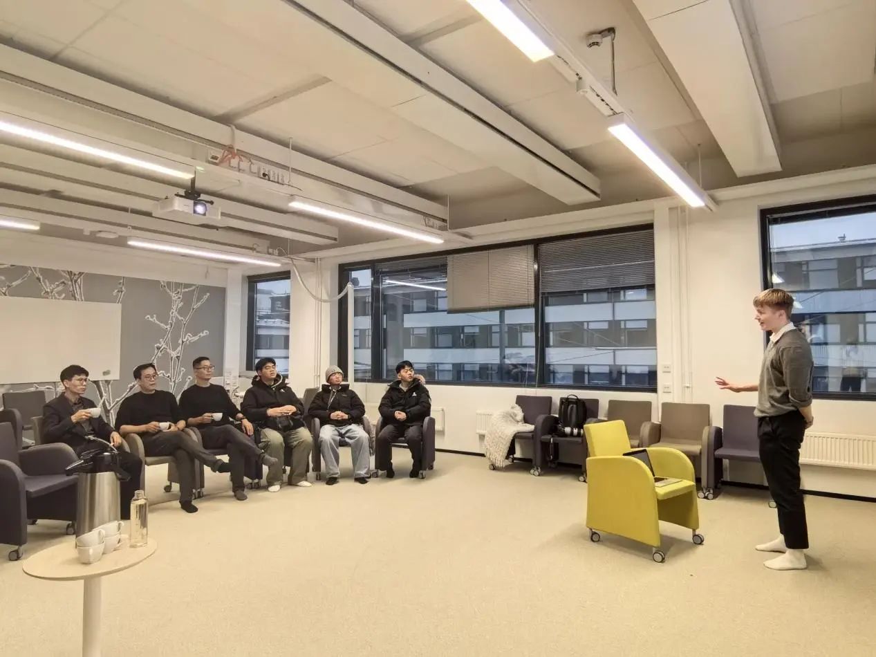 第二日的行程中,访学团赴坦佩雷应用科技大学进行参访,在企业家学园Coach教练刘熹接待下,访学师生参观了校园并体验了该校独特的教育环境和学术氛围。刘熹教练详细介绍了企业家学园的办学理念、课程设置以及培养模式,让访学团师生对企业家学园的教育模式和创业支持有了全面的认识。
