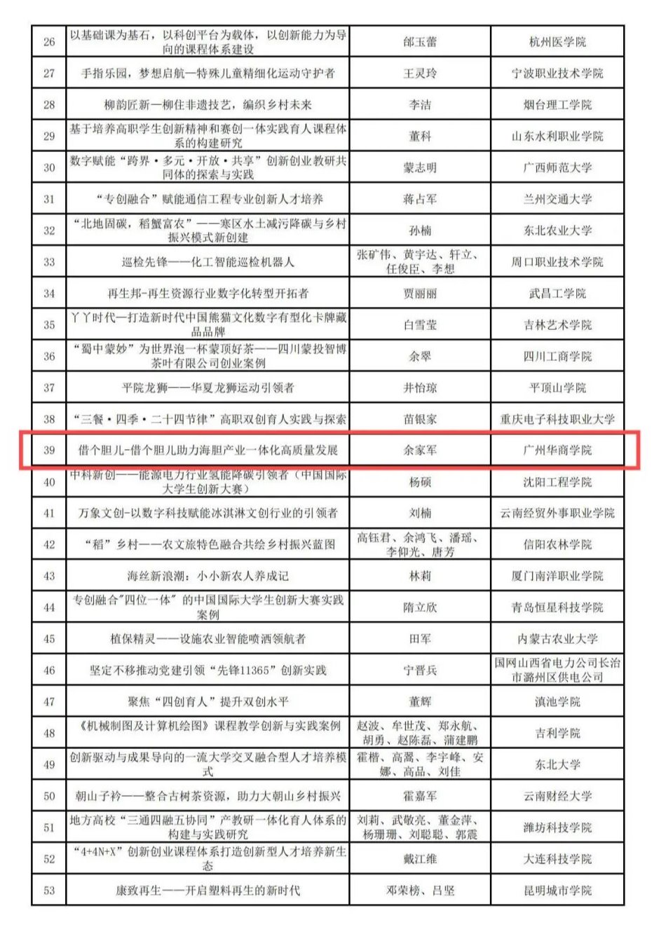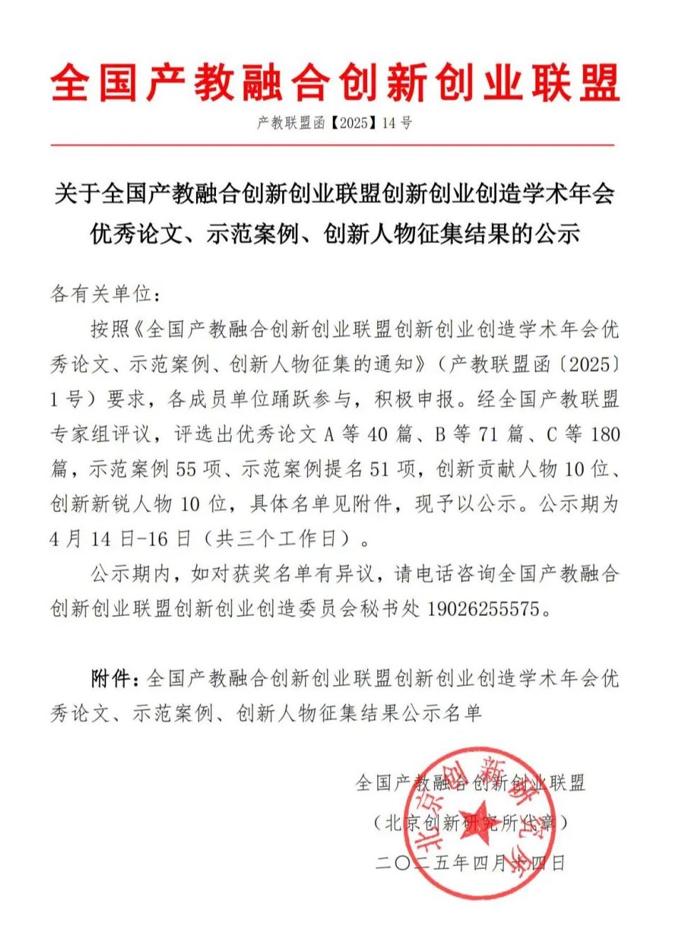 2025年4月14日,按照《全国产教融合创新创业联盟创新创业创造学术年会优秀论文、示范案例、创新人物征集的通知》(产教联盟函〔2025〕1号)文件通知,经全国产教联盟专家组评议,威廉希尔“借个胆儿——借个胆儿助力海胆产业一体化高质量发展”案例获评全国产教融合创新创业联盟创新创业创造学术年会示范案例,余家军教授获评全国产教融合创新创业联盟创新创业创造学术年会“创新新锐人物”。